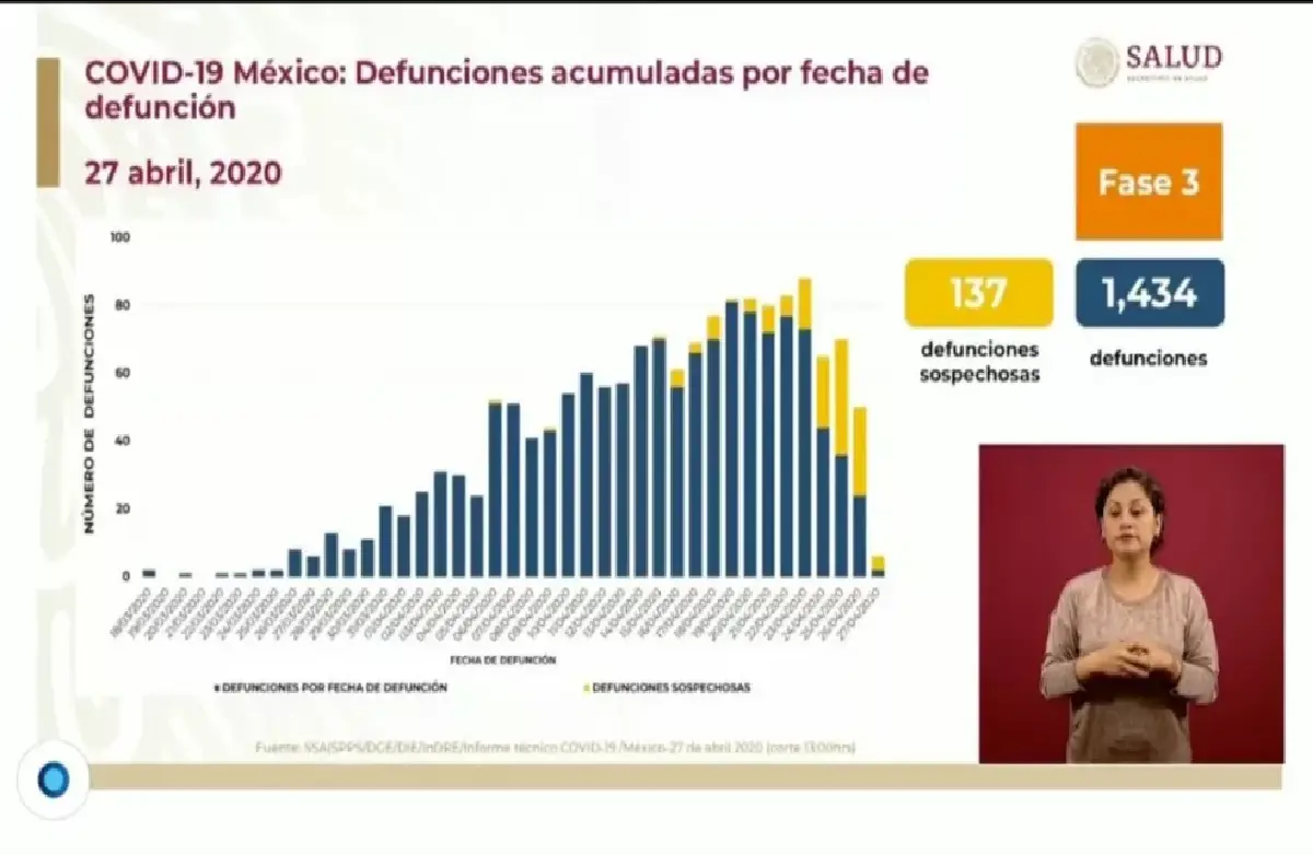 A este día se lleva el registro de 1 mil 434 personas fallecidas y 137 defunciones sospechosas. Los estados con más personas muertas por covid-19 son: Ciudad de México, Baja California, Estado de México, Sinaloa, Tabasco, Quintana Roo, Puebla y Chihuahua.