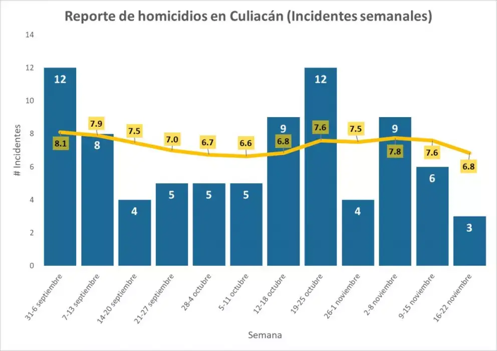 Recomendaciones para el fortalecimiento de la seguridad y la construcción de paz en Culiacán. Con un registro de 3 asesinatos, el promedio semanal de homicidios pasó de 7.6 a 6.8 en la semana de medición. Es importante alejar a los jóvenes de las actividades relacionadas con el crimen organizado a fin de disminuir su incidencia en la ciudad por medio de actividades culturales o recreacionales que les muestren mayores opciones de vida.