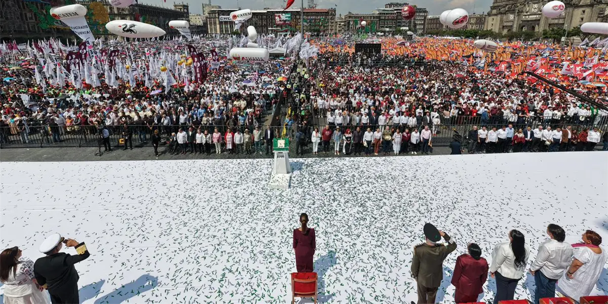 “Desde este Zócalo histórico reafirmamos nuestro compromiso con la Cuarta Transformación de la Vida Pública de México. Vamos por el camino correcto, de pie, con la fuerza de nuestra historia, el orgullo de nuestro presente y la esperanza del porvenir”, afirmó la mandataria.