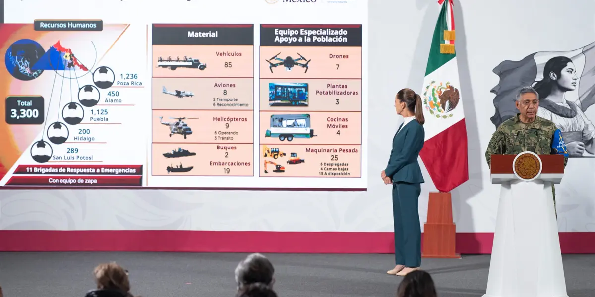 • Ayer se abrieron 3 puentes aéreos para los estados de Hidalgo, Puebla y Veracruz. La presidenta ordenó refuerzos para el estado de Veracruz. Llegarán mil nuevos efectivos.
