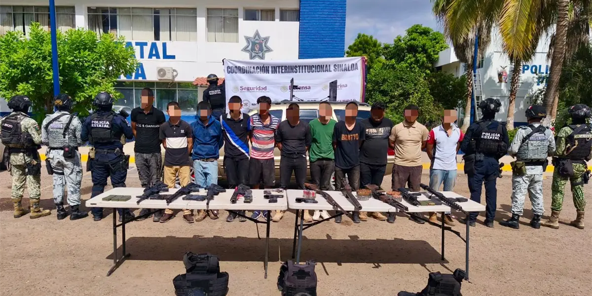 Una denuncia anónima al 089 permitió la detención de 11 hombres armados en Navolato. En el lugar se aseguraron fusiles, equipo táctico y una camioneta con blindaje artesanal.