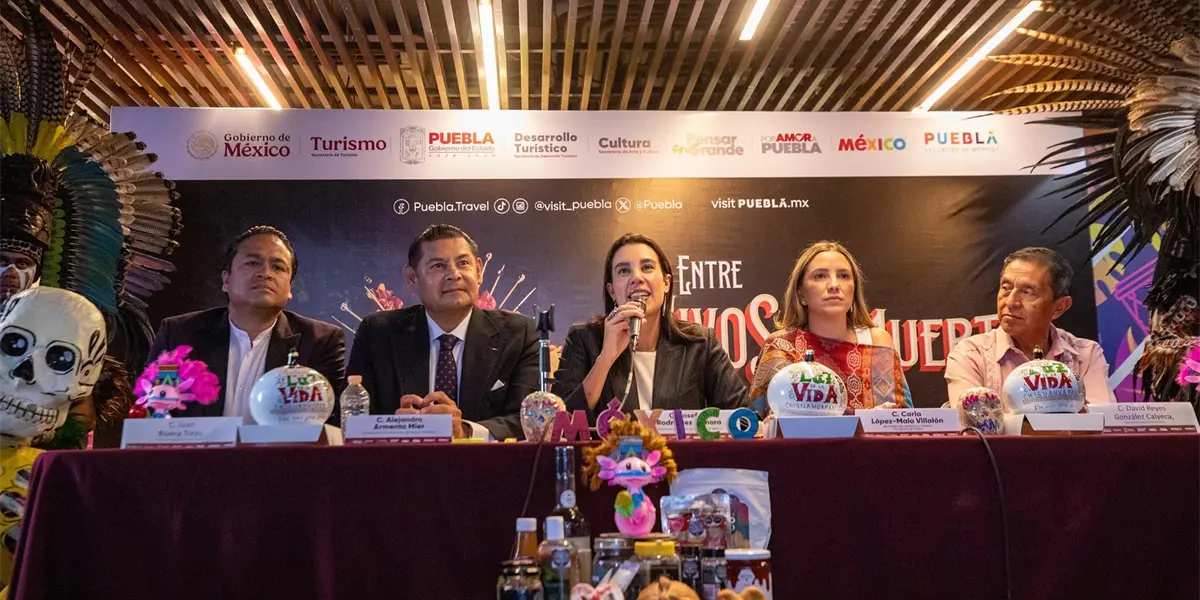 La secretaria de Turismo del Gobierno de México, Josefina Rodríguez Zamora, y el gobernador de Puebla, Alejandro Armenta Mier, presentaron la cartelera de actividades con motivo de la temporada de Día de Muertos en el estado, que incluirá más de 45 eventos.