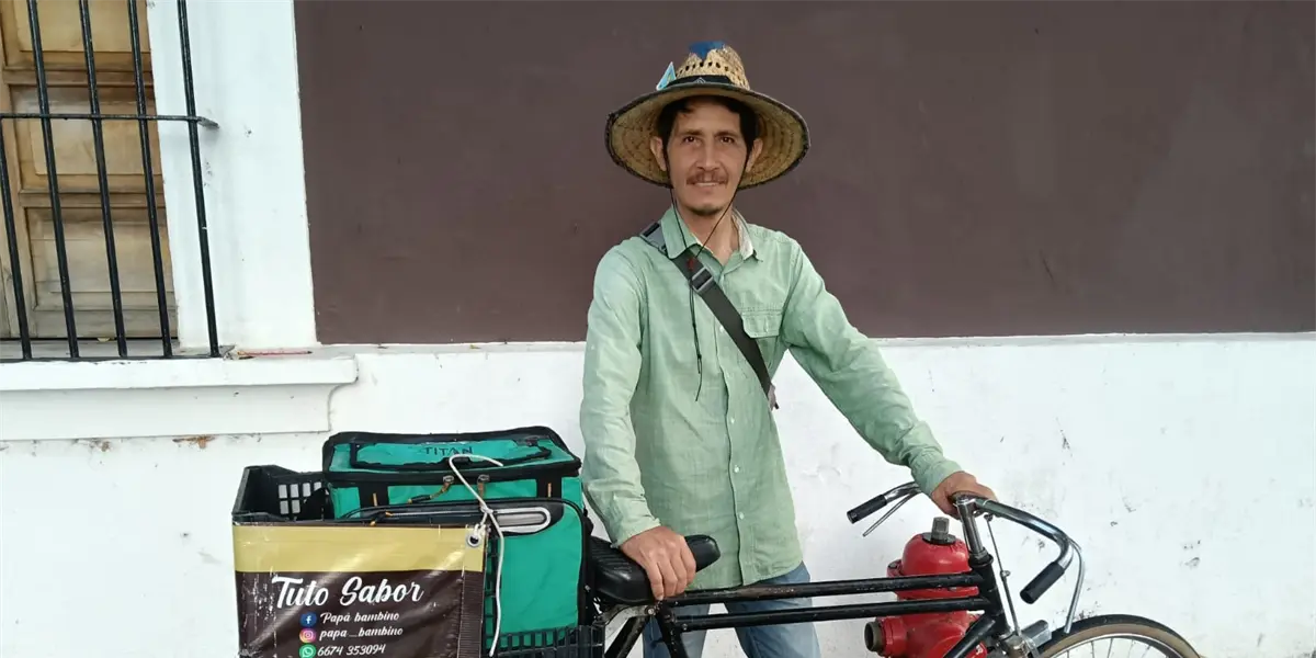 Con su bici clásica y su negocio “Papá Bambino”, recorre las calles de Culiacán vendiendo baguettes y cuernitos hechos de manera artesanal.
