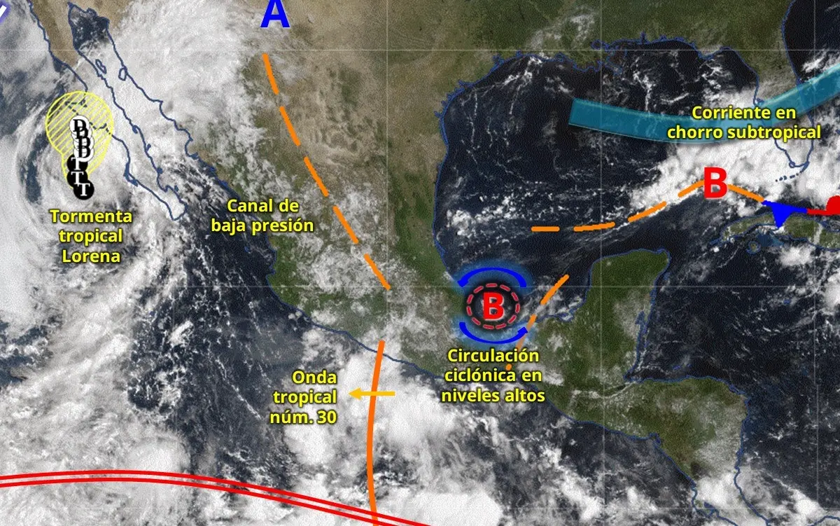 El ciclón tropical Lorena, canales de baja presión, ondas tropicales y la entrada de aire húmedo generarán condiciones adversas que afectarán principalmente al noroeste, centro, sur y sureste del país, de acuerdo con el pronóstico extendido del viernes 5 al domingo 7 de septiembre, del Servicio Meteorológico Nacional (SMN).