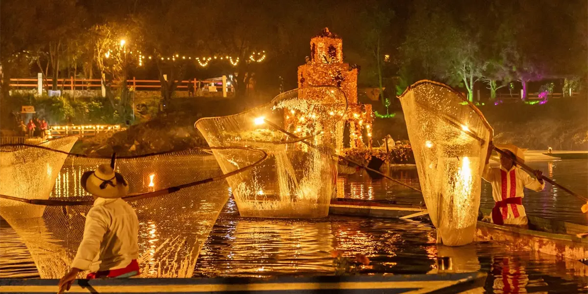 Durante el Día de Muertos en Pátzcuaro, el lago se ilumina con las antorchas y redes de los pescadores, creando una escena mágica que parece salida de un sueño.