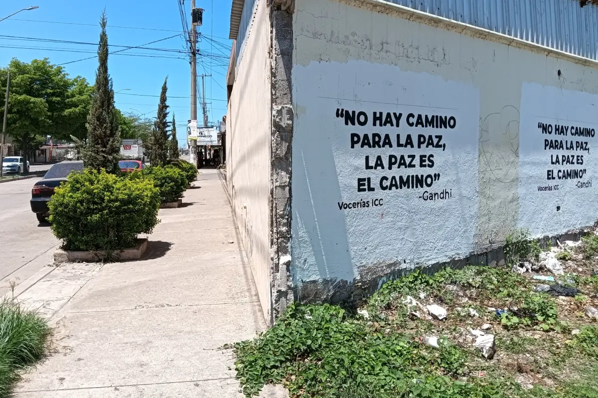"No hay camino para la paz, la paz es el camino", es la frase de Gandhi, firmada por Vocerías ICC, plasmada en la pared de un baldío en la esquina de Emile Berline y bulevar Orquídeas, frente al Jardín de Niños Lupita Almaral.