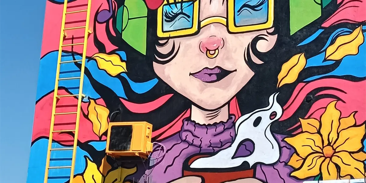 A unas cuadras, el artista Gustavo Leal llenó de color un muro con la pintura “Un Sorbo de Armonía”. Entre aerosoles y óleo, dio forma a una mujer que sonríe al despertar con música y café.