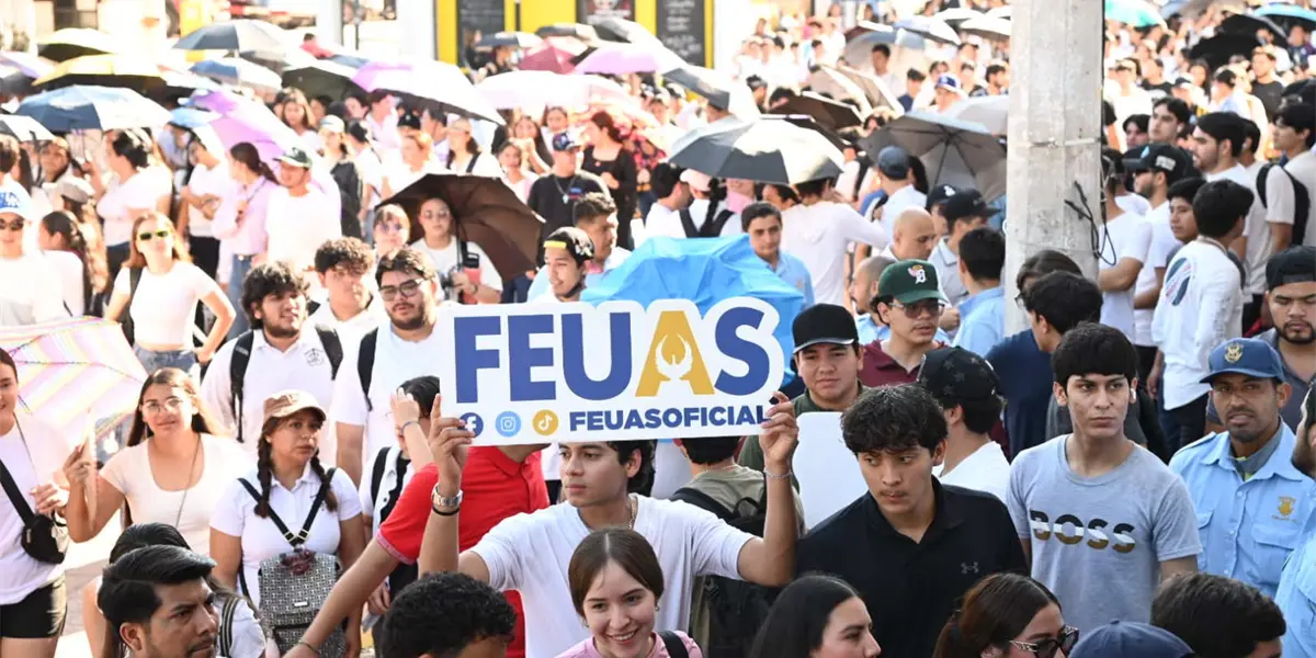 El recorrido inició en la Catedral de Culiacán y concluyó en la explanada del Edificio Central de la Casa Rosalina, donde los jóvenes escucharon un mensaje de Ángel Gamaliel Cañedo Reyes, presidente de la FEUAS.