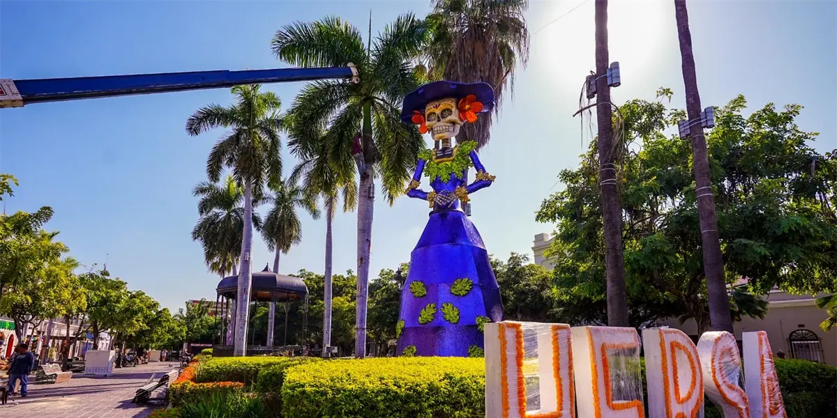 La escultura, que se erige majestuosa frente a la Plazuela Machado, forma parte de las actividades que enmarcan las celebraciones del Día de Muertos 2025 organizadas por el Gobierno de Mazatlán a través del Instituto Municipal de Cultura, Turismo y Arte.