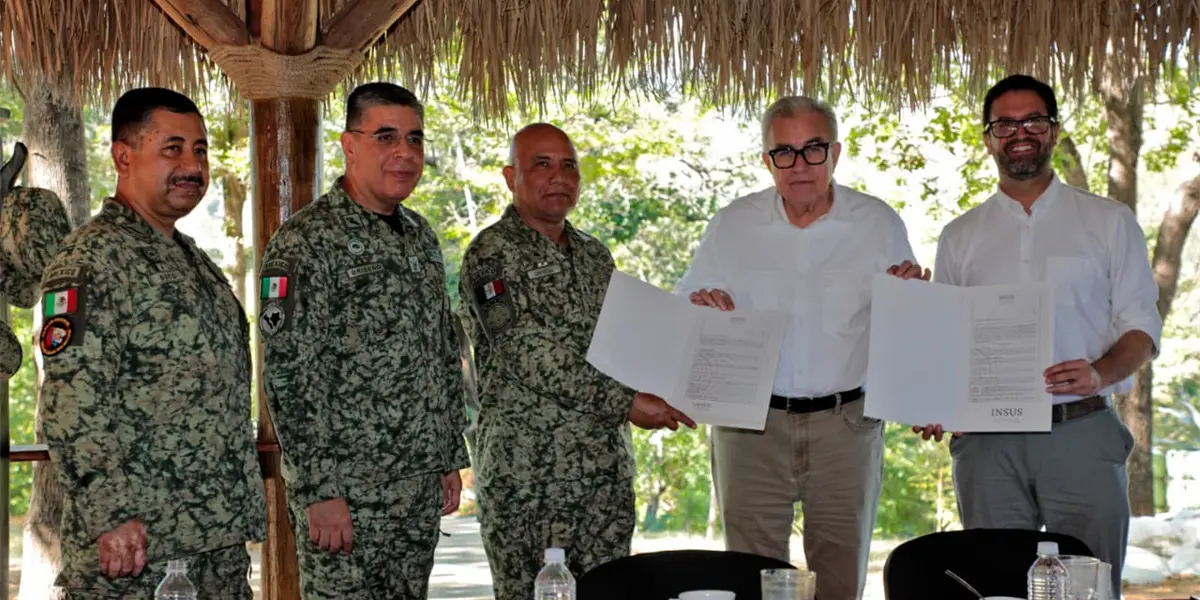 El gobernador Rocha estuvo acompañado por el director del Instituto Nacional del Suelo Sustentable (INSUS), José Alfonso Iracheta Caroll, durante el acto formal celebrado en el Cuartel General de Mando Especial de Badiraguato.