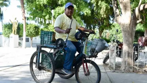 Villa Juárez, Navolato. Mateo Saldaña Villanueva nació y creció en un pequeño pueblo de Guerrero, en donde se dedicaba al trabajo de campo. Ahora es un ejemplo de fortaleza en Villa Juárez desplazándose en un triciclo que mueve con su mano.