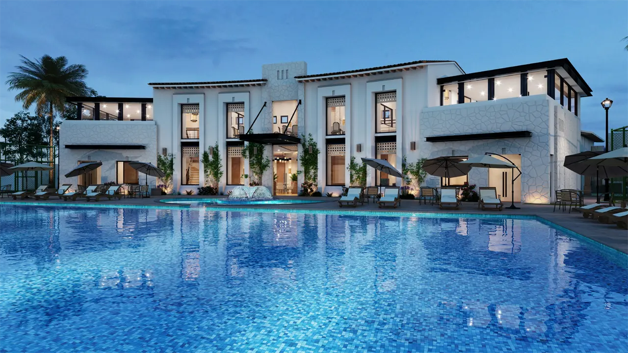 - Una cocina de diseño europeo que se integra con el área de piscina.