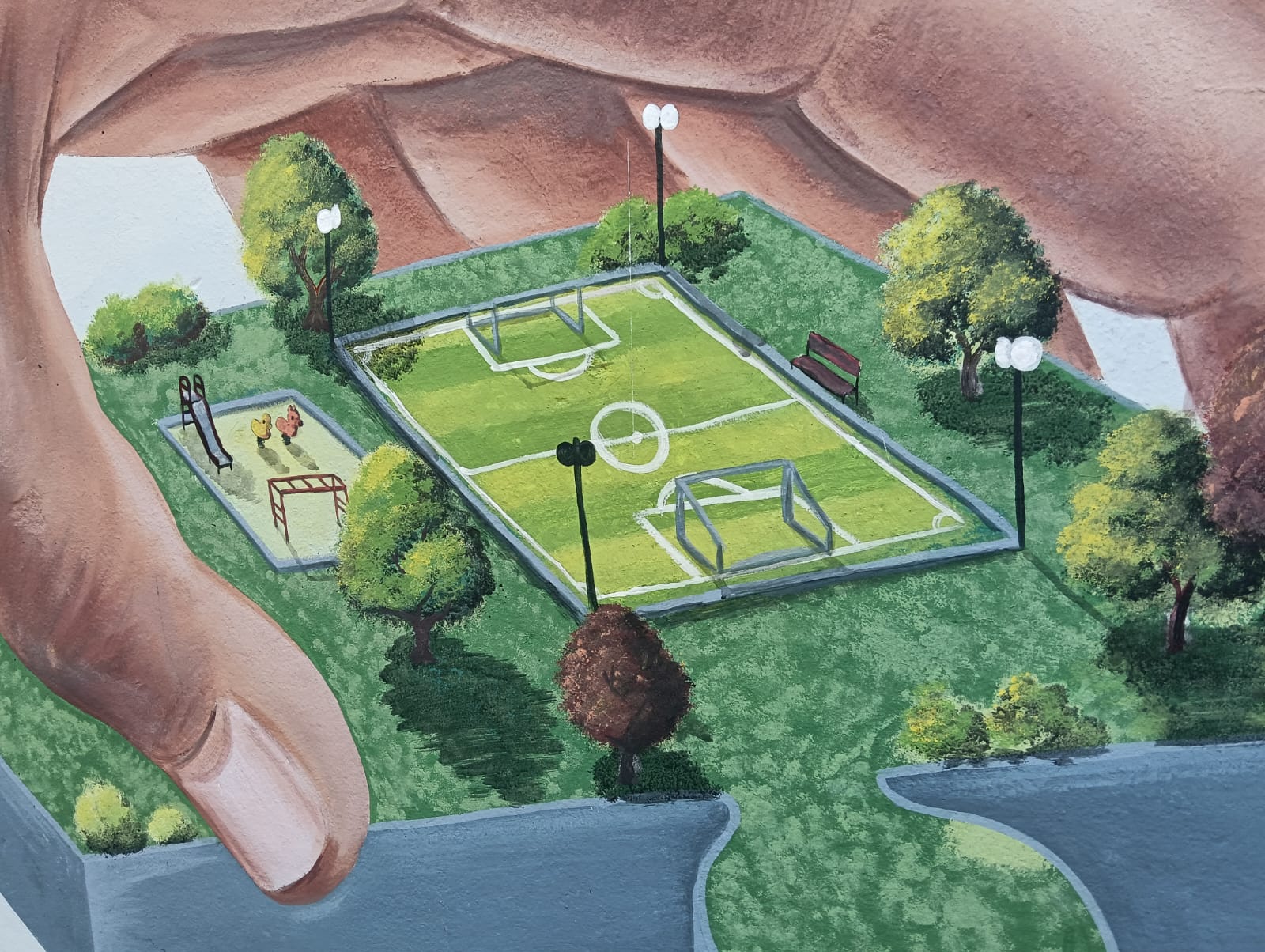 Hoy luce como un gran rompecabezas en el que cada pieza tiene vida propia: una ciudad pacífica, canchas de fútbol y otros deportes, árboles, naturaleza… todos los elementos que imaginan los vecinos para su colonia. En el centro, unas manos que arman el rompecabezas, como si estuvieran construyendo paso a paso una ciudad en paz.