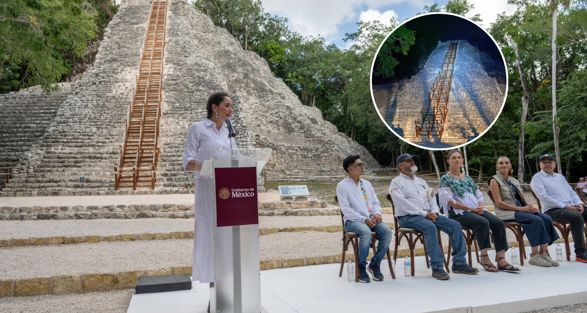 Claudia Curiel de Icaza, secretaria de Cultura del Gobierno de México, inauguró la nueva escalinata del basamento Nohoch Mul en Cobá, Quintana Roo, una obra clave para proteger la estructura y mejorar la experiencia turística.