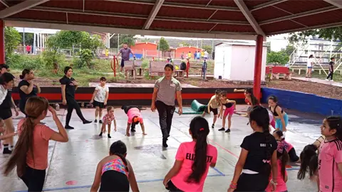 “Me da gusto ver que asisten a las clases de gimnasia, ya que este deporte les ayuda a desarrollar habilidades y les brinda más seguridad a sus hijas. Además, mejora su rendimiento escolar al estimular la concentración, la coordinación y la disciplina”, señaló el suboficial.