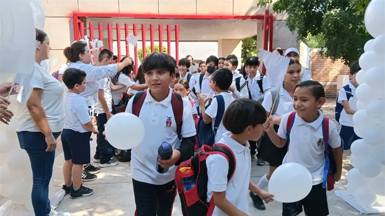 Con globos blancos y canciones, niños de primaria en Los Huertos alzan la voz por la paz en Culiacán