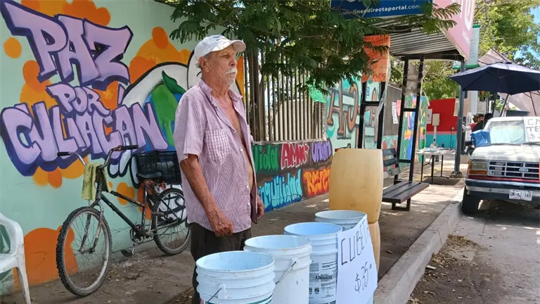 Con su triciclo cargado de cubetas y garrafones, se instala cada mañana, de lunes a sábado, en la esquina de Álvaro Obregón y Profesora Josefina Chang, donde se sienta frente a un amplio y llamativo mural que para los transeúntes es un grito de exigencia de paz para Culiacán.
