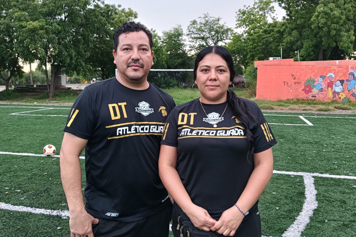 En este remozado espacio, José Guadalupe Salcido Reyes y Saira Gutiérrez Sánchez dirigen Atlético Guada, una escuelita de futbol nacida del amor: amor al deporte, a la enseñanza y, claro, el amor que los unió hace más de una década en una cancha como esta.