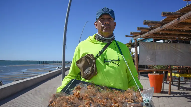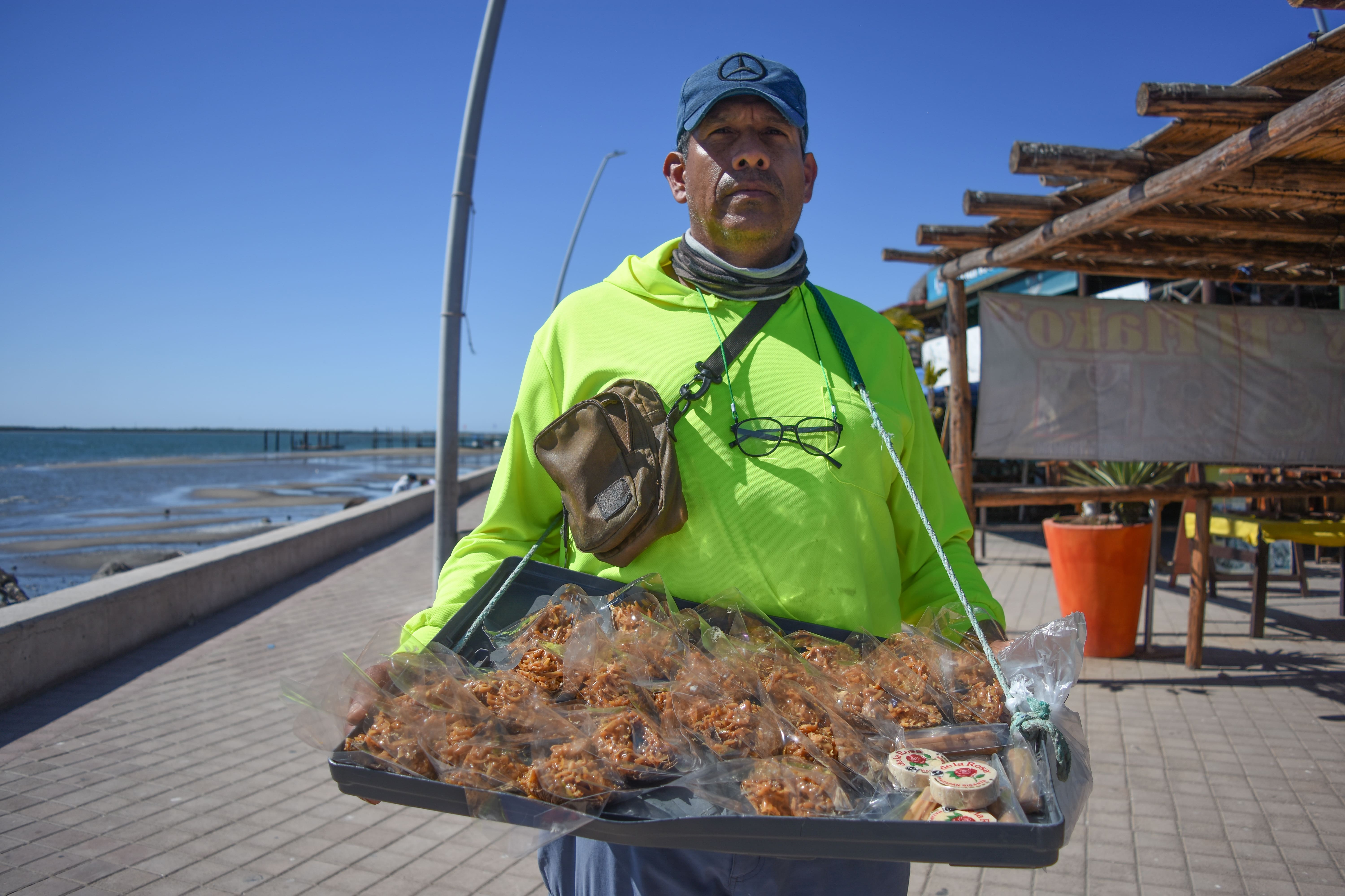 En el malecón de Altata, entre el olor a mar y la alegría de los visitantes, una figura conocida recorre los restaurantes y calles con una sonrisa y una charola llena de dulces.