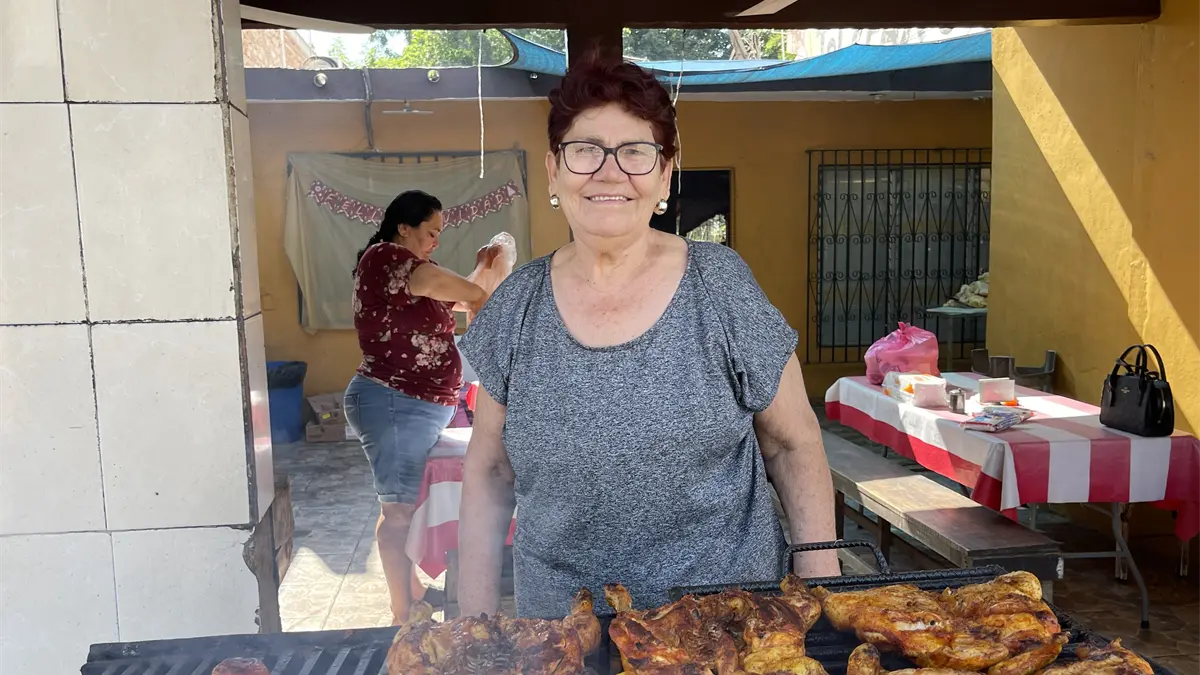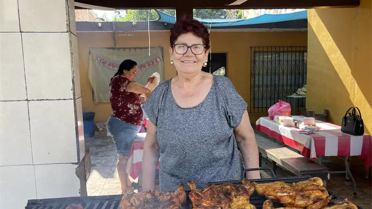 Doña Irma se mantiene activa, desde muy temprano se levanta para limpiar el espacio donde sus hijas preparan y venden los pollos y carne asada.