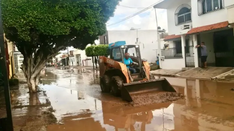 Las acuadrillas se apoyan con maquinaria para agilizar las acciones de limpieza en las calles de Jacarandas, donde se realiza lavado y retiro de lodo.