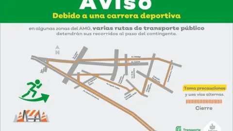 Con motivo del Maratón Guadalajara que abarcará varias zonas del Área Metropolitana de Guadalajara, de las 5:30 a las 4:00 horas del domingo 5 de noviembre, algunas rutas del transporte público detendrán su recorrido mientras pasa el contingente de corredores.