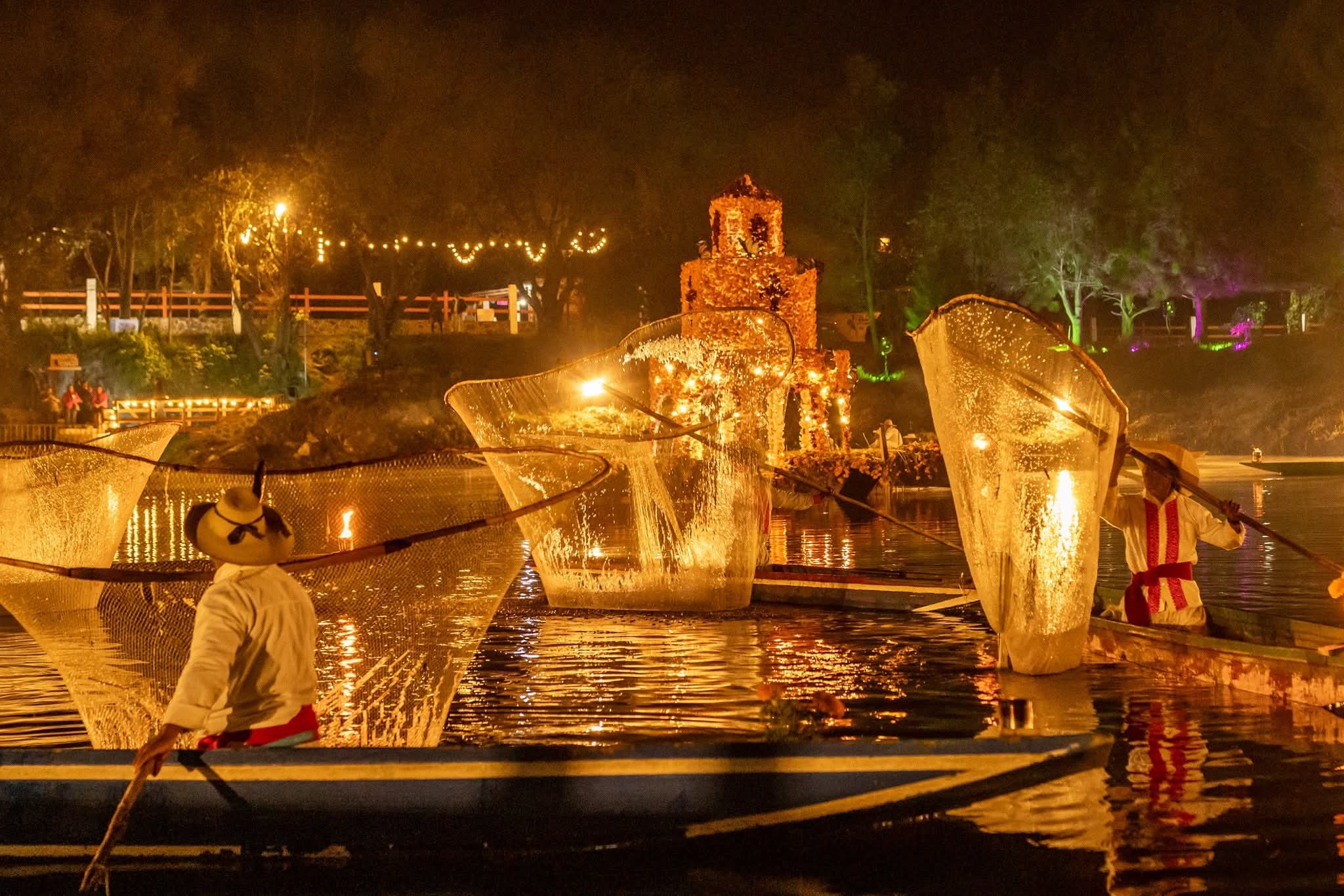 Durante el Día de Muertos en Pátzcuaro, el lago se ilumina con las antorchas y redes de los pescadores, creando una escena mágica que parece salida de un sueño.