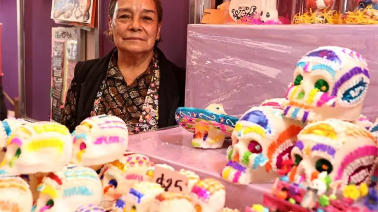 Trinidad Flores es una de las artesanas del Estado de México, que durante décadas su familia se ha dedicado a moldear calaveras y otras figuras de alfeñique, quien forma parte de la Feria y Festival Cultural Alfeñique 2025, que se realiza en Toluca.