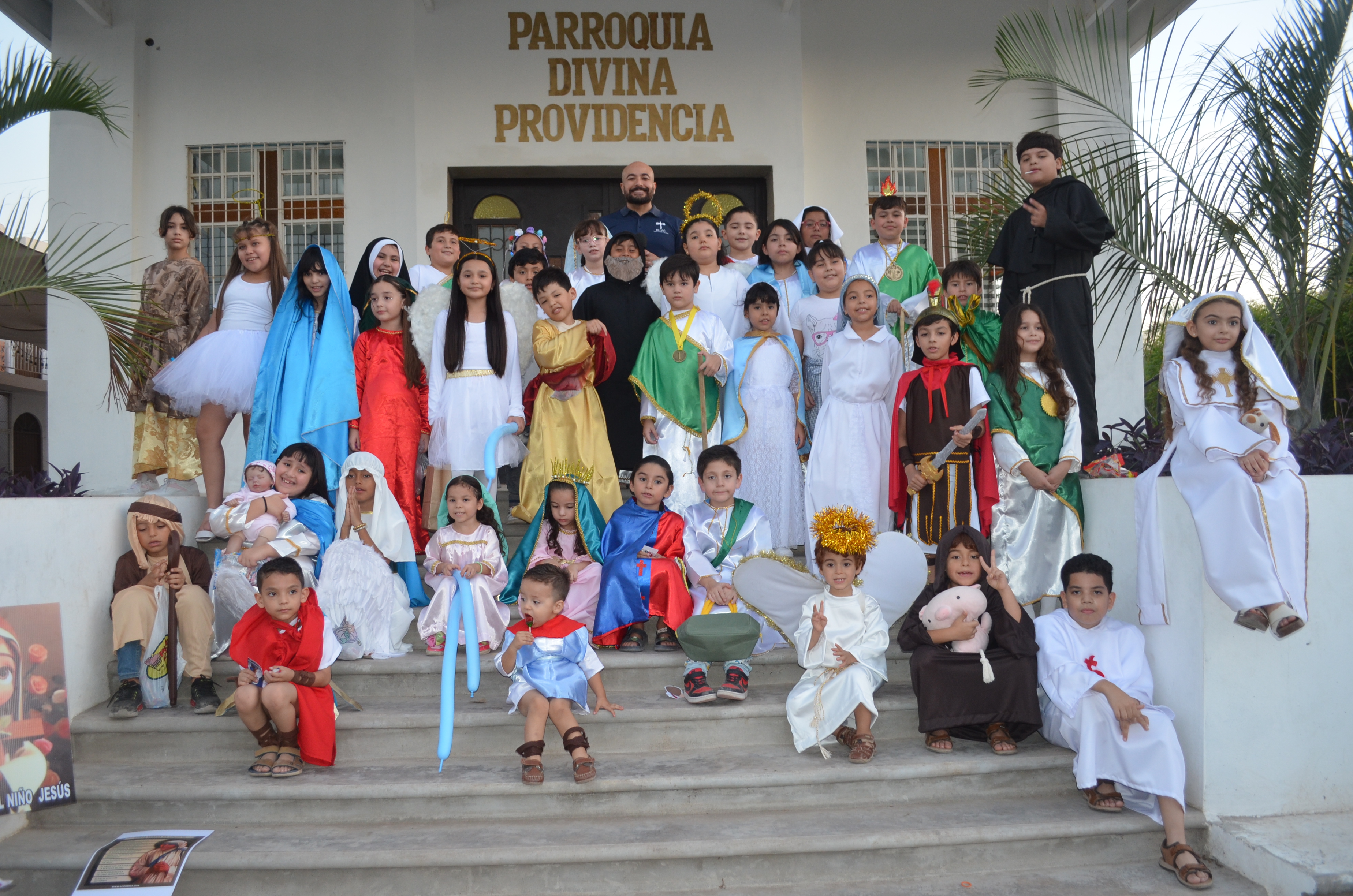 Decenas de pequeños y pequeñas del catecismo, acompañados por sus padres, participaron en el tradicional recorrido por las calles aledañas a la iglesia. Con sonrisas y entusiasmo, los y las infantes se vistieron como figuras ejemplares de la fe: