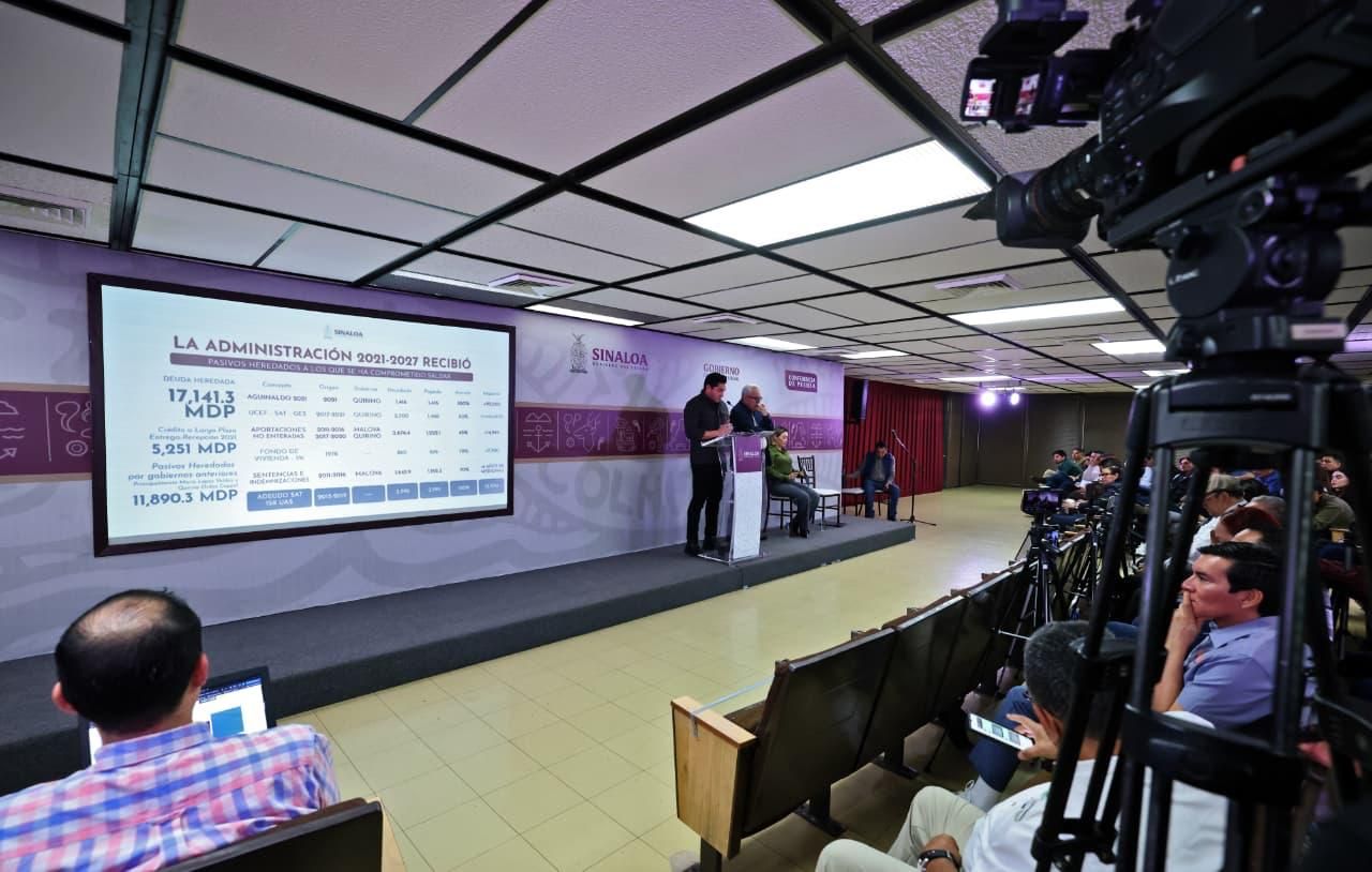 Durante la Conferencia Semanera, el secretario de Administración y Finanzas, Joaquín Landeros Güicho, detalló que el gobierno de Rubén Rocha Moya recibió una deuda heredada de 17 mil 141 millones de pesos de las administraciones de Mario López Valdez y Quirino Ordaz Coppel, integrada por 11 mil 890 millones de retenciones no enteradas sin fuente de pago y 5 mil 251 millones de pesos de deuda a largo plazo.