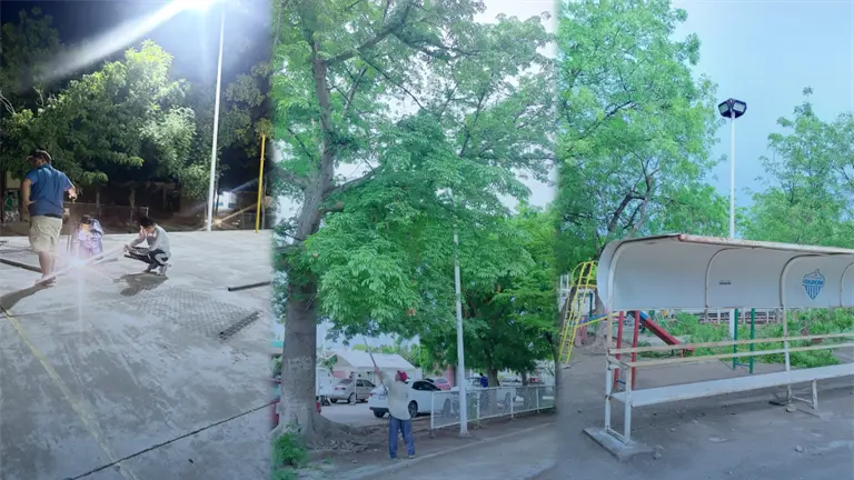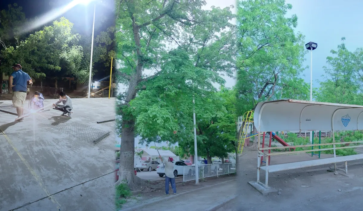 Se construyeron poyetes para proteger los árboles, se sembraron plantas en maceteros, se repararon columpios dañados, se restauró la malla perimetral y se levantó una nueva puerta de acceso.